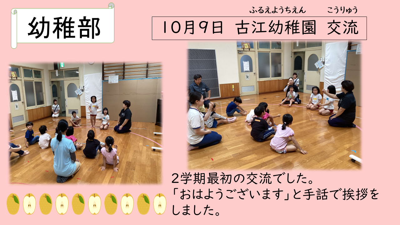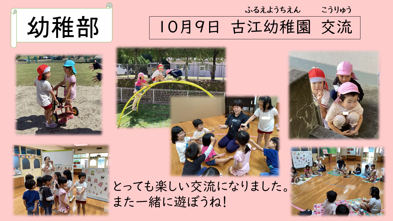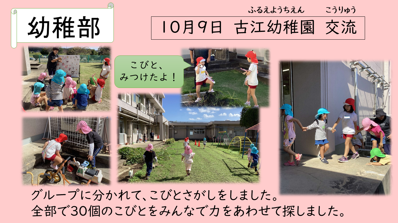 幼稚部 古江幼稚園交流 2025年10月10日 10月9日、古江幼稚園の子ども達と交流をしました。 今回の交流は、古江幼稚園のお友達がろう学校に来て、こびとさがしをしたり、一緒にお弁当を食べたりしました。 次回は10月28日、一緒に秋の遠足に出かける予定です。 楽しみです!